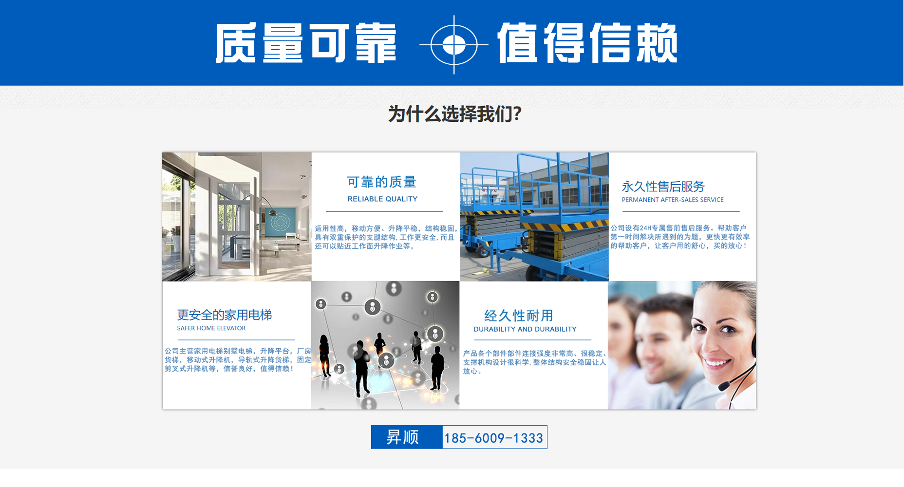山東昇順液壓升降機械有限公司是一家主營家用電梯,別墅電梯,升降平臺,廠房貨梯,移動式升降機,導軌式升降貨梯,固定剪叉式升降機等產品企業,質量可靠,值得信賴。 用戶至上,以用戶為中心”是公司永遠堅持的服務宗旨,贏得用戶的贊許是我們的榮譽,及時滿足用戶的需求,是我們公司的愿望。長期以來,公司員工以優質的服務,取悅于用戶,以誠信的言行取信于用戶,得到了用戶們的好評。我們期待著與您更加愉快的合作!公司的發展,離不開社會的大力支持,在社會的支持和幫助下,我們正昂首闊步邁向未來! 我們的經營方針是:以質量求生存,以產品求發展,以信譽保合作,以服務贏客戶。 本公司對產品質量和各項服務恪守合同承諾,并愿與新老客戶精誠合作,共創未來。 公司精神:創新是主題,超越是不懈的追求。 公司宗旨:信譽保證,誠信為本。 我們會以合理的價格,良好的信譽,雄厚的實力,優質的產品,最周到的服務,服務于廣大新老客戶!...
